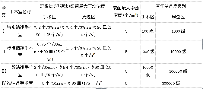 Ⅰ | 特别洁净手术室 | Ⅰ | 关节置换手术、器官移植手术及脑外科、心脏外科和眼科等手术中的无菌手术 |